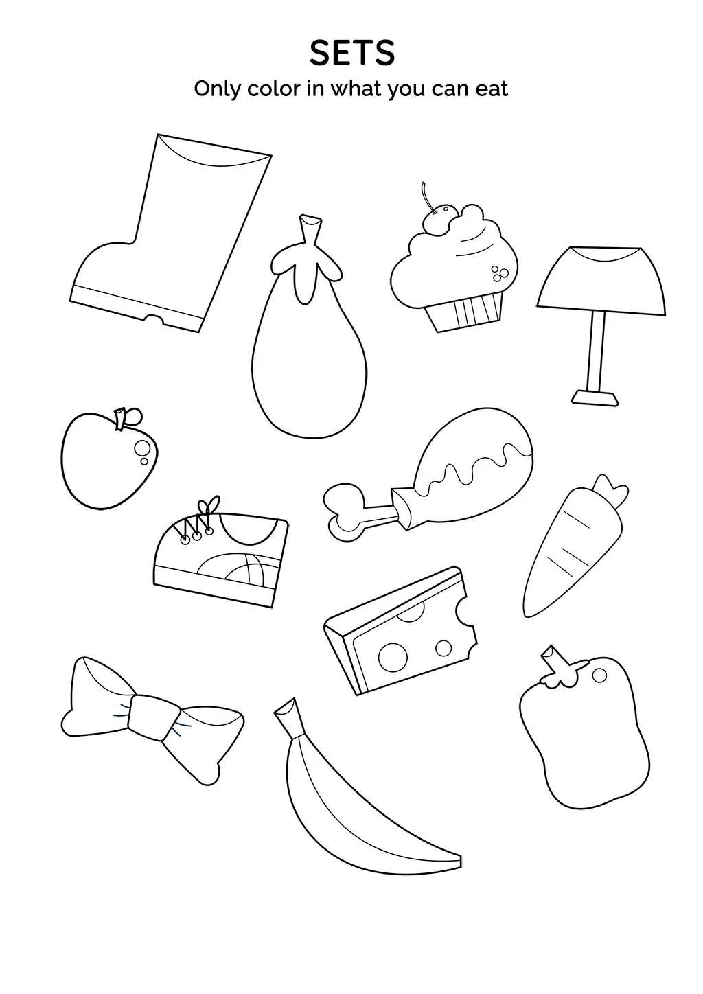 This activity focuses on sets and involves coloring specific items that can be eaten. The items include a boot, an eggplant, an apple, a shoe, a cupcake, a chicken leg, a light bulb, cheese, a carrot, a bowtie, a banana, and a bell pepper.