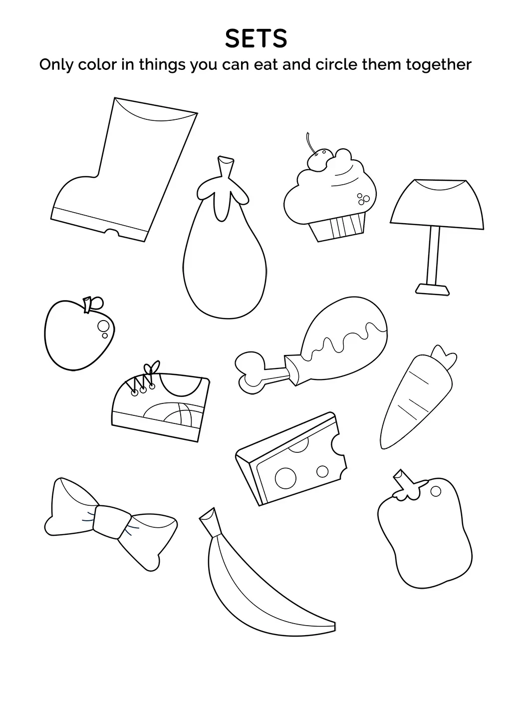 This activity focuses on sets and involves coloring specific items that can be eaten. The items include a boot, an eggplant, an apple, a shoe, a cupcake, a chicken leg, a light bulb, cheese, a carrot, a bowtie, a banana, and a bell pepper. The task is to color only the edible items and connect them with lines to group them.