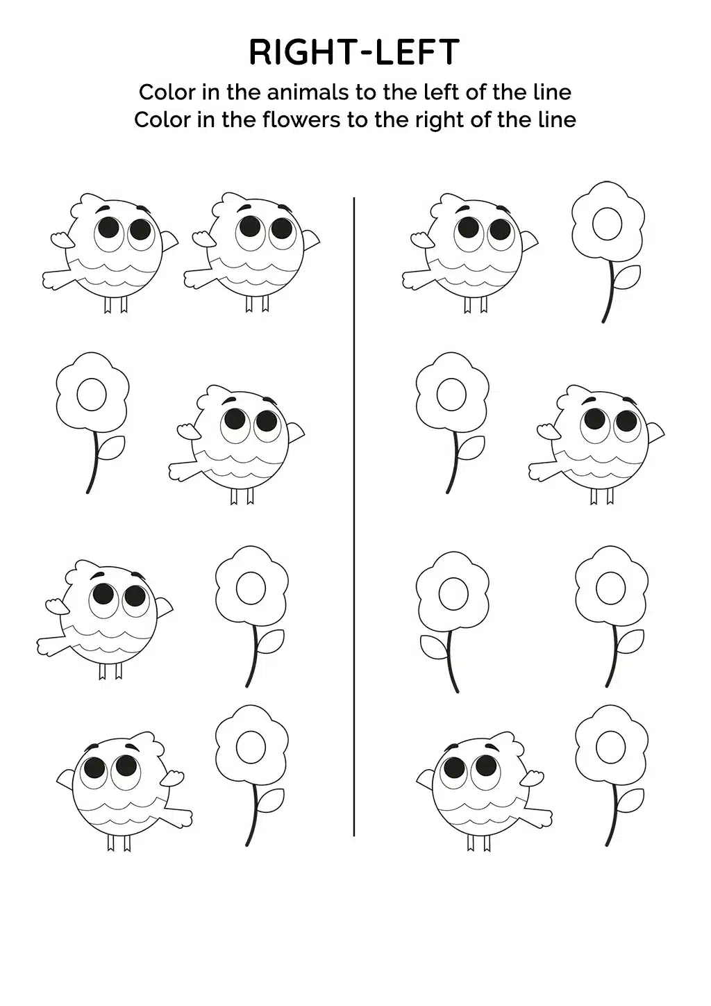 Engage in a coloring activity where children enhance their spatial perception skills by coloring animals to the left of the line and flowers to the right of the line.