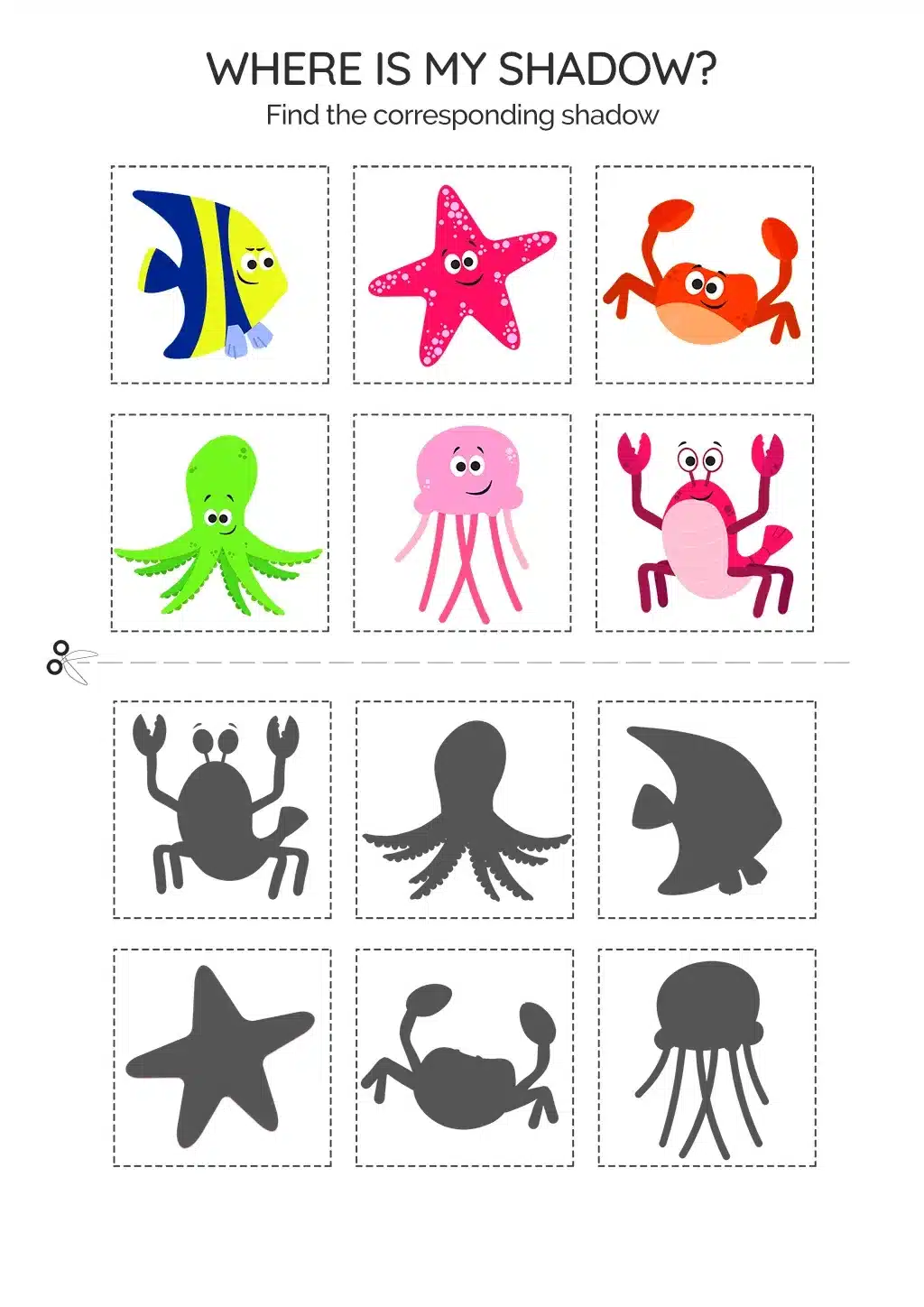 The worksheet features a fish, a starfish, a crab, an octopus, a jellyfish, and a lobster, along with their respective shadows to be connected.