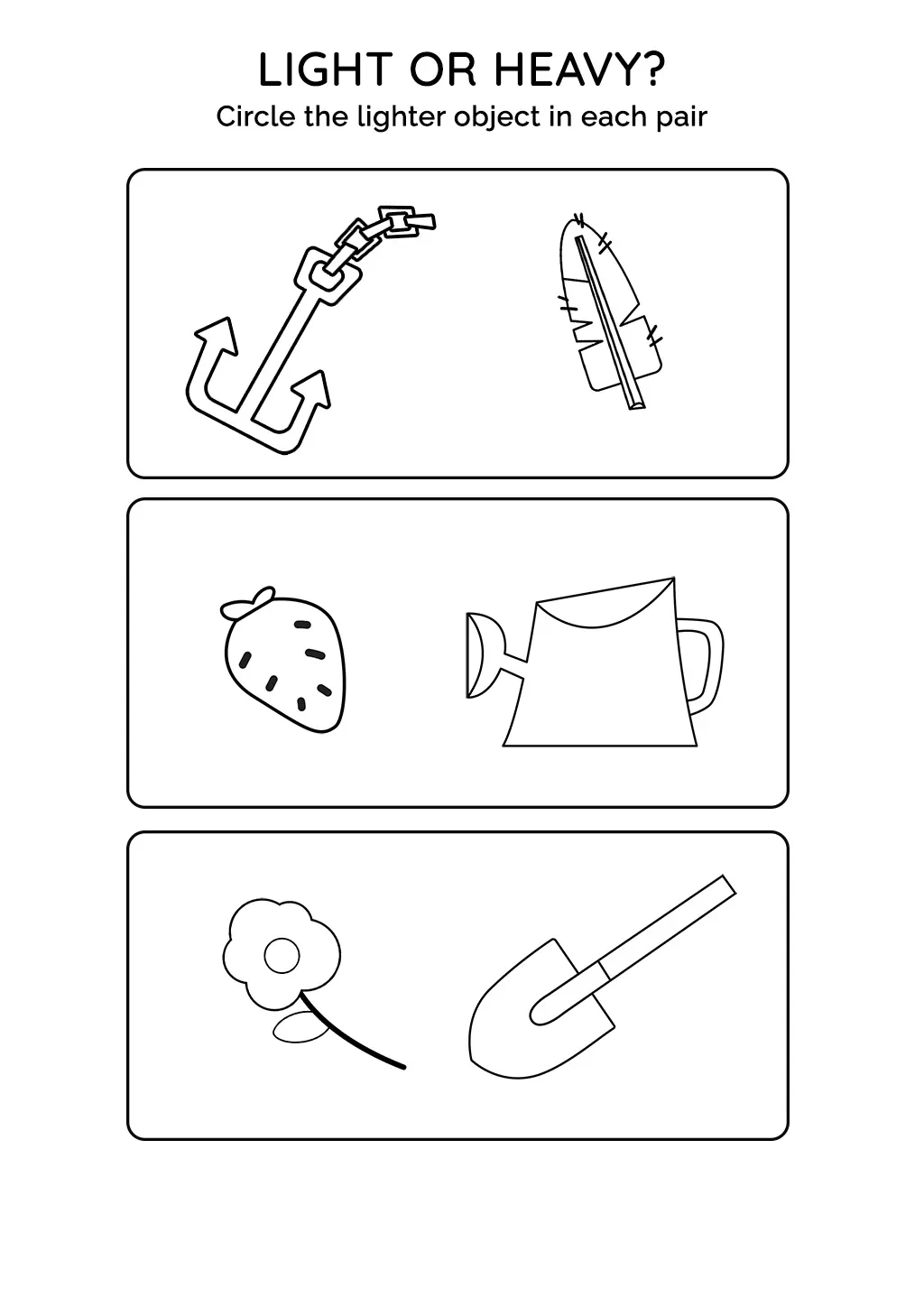 This worksheet will help your child develop an understanding of weight by identifying and circling the lighter object in each pair.