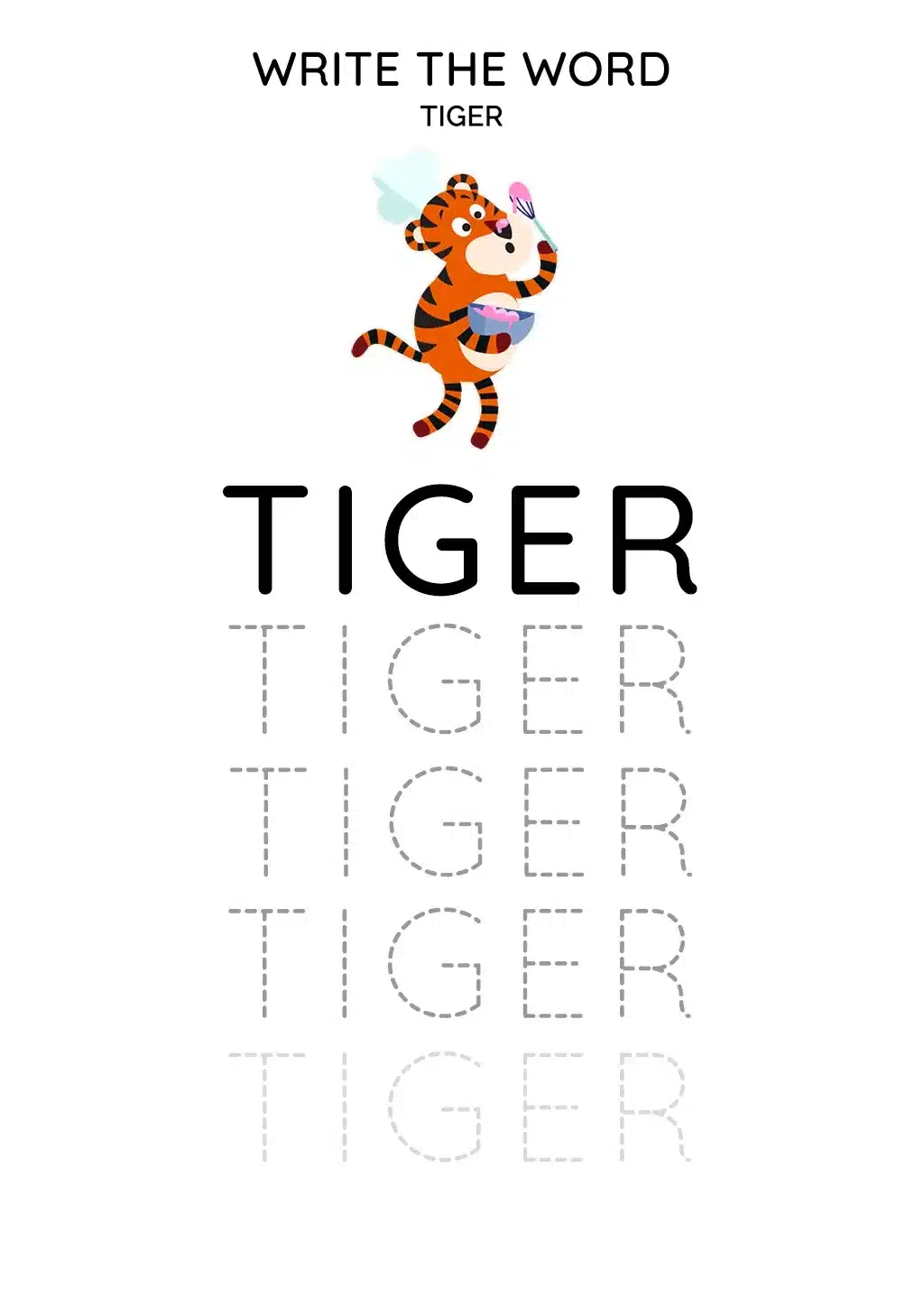 The activity promotes handwriting skills and word recognition simultaneously. It enables children to understand the formation of letters and the concept of creating words. Writing the word "Tiger" is a fitting exercise as it introduces kids to a combination of letters that is simple enough for a 6-year-old to understand and write.
