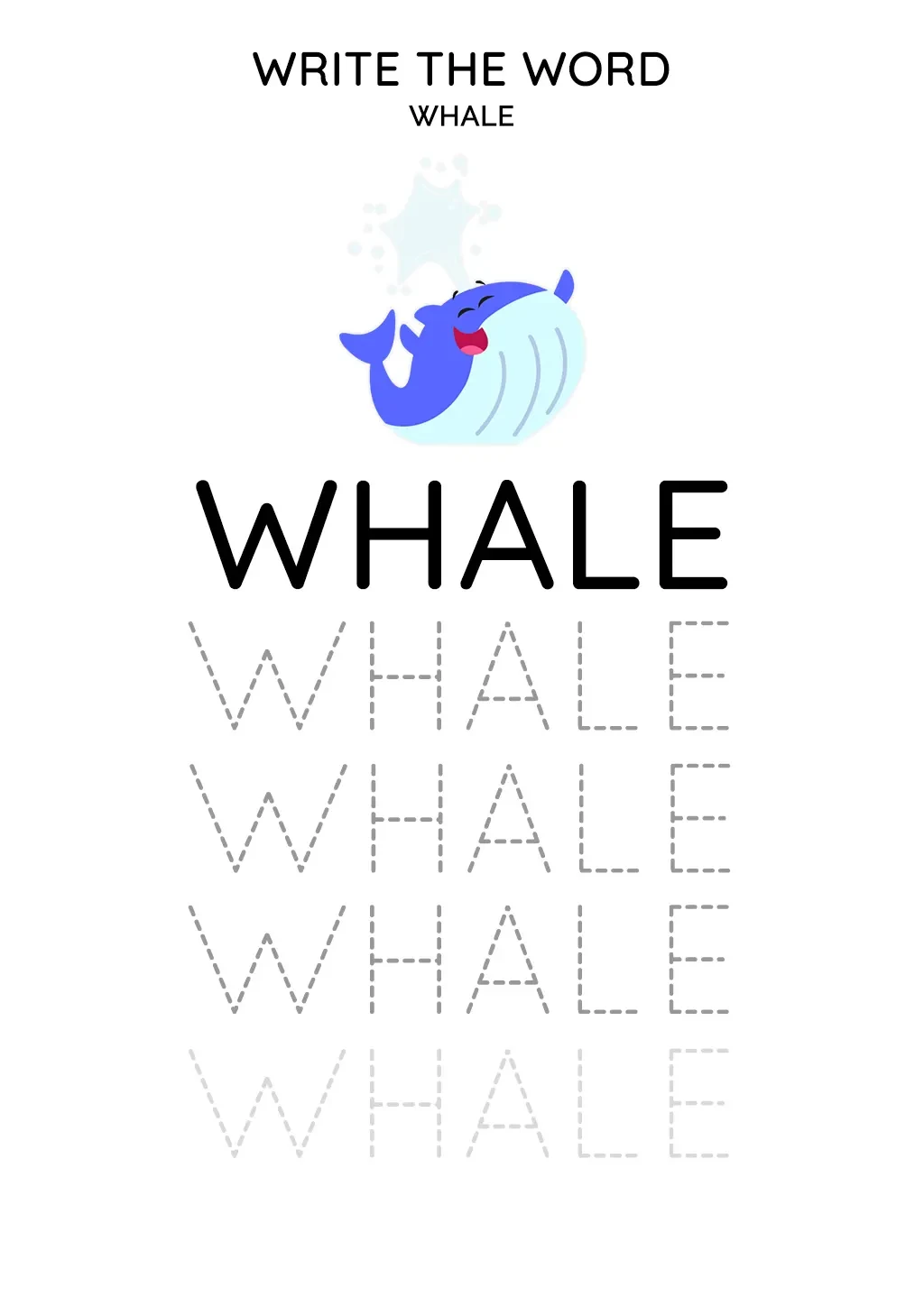 This activity not only promotes handwriting practice but also aids in word recognition. Writing the word "Whale" offers a balance of different letters, making it a suitable task for 6-year-olds to understand and write, further familiarizing them with the formation of letters and spelling.